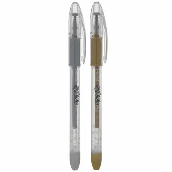 Give your writing some extra shimmer or create dazzling works of art with these Sparkling Metallic Gel Pens! This set includes a gold and a silver pen, each featuring reflective, sparkling iridescent ink. The smooth ink gel also boasts a different shade on white versus black paper. The pens are also complete with extra-long barrels and latex-free grips that give you effortless control. They are perfect for cards, drawing, doodles, writing, and more!
