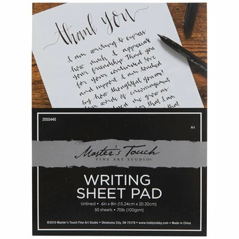 Practice your handwriting with foundations like Writing Sheet Paper Pad. This unlined paper offers a white, lightweight base. Use ink, graphite, and other writing mediums to practice various lettering techniques!